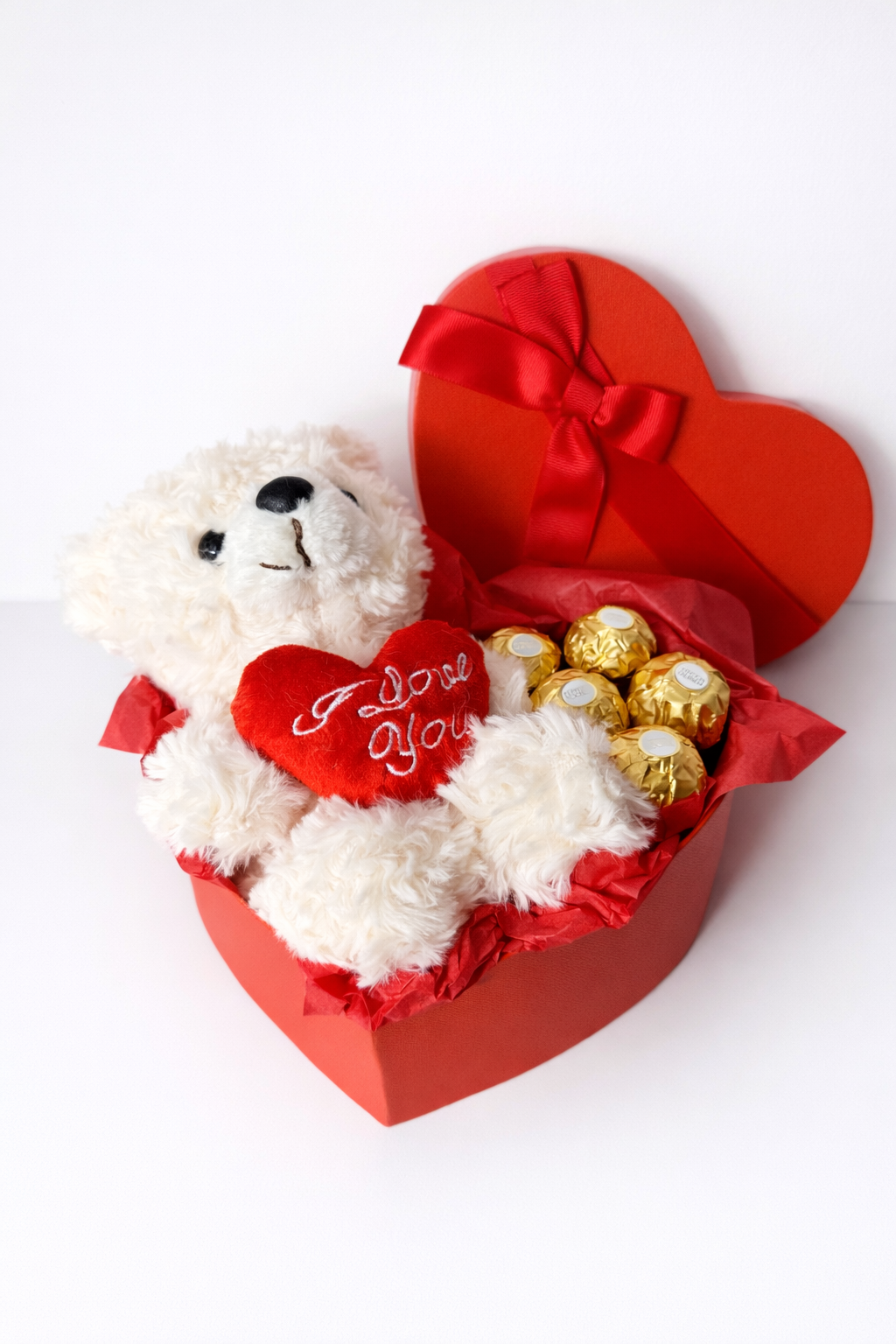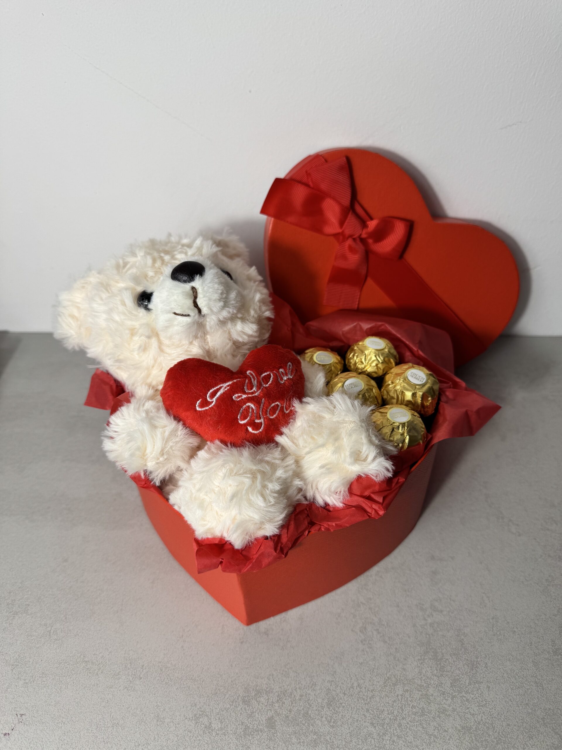 À l’intérieur, un adorable ourson tout doux tenant son petit coeur » i Love You « , accompagné de délicieux chocolats Ferrero Rocher.