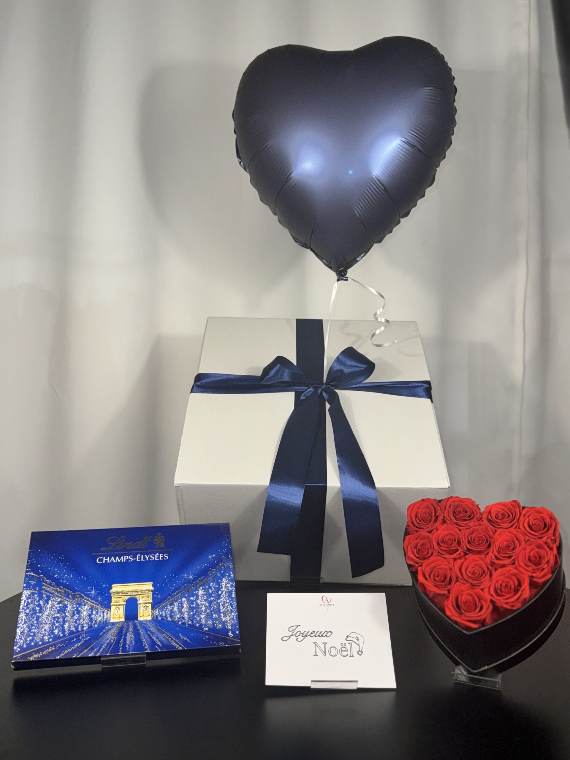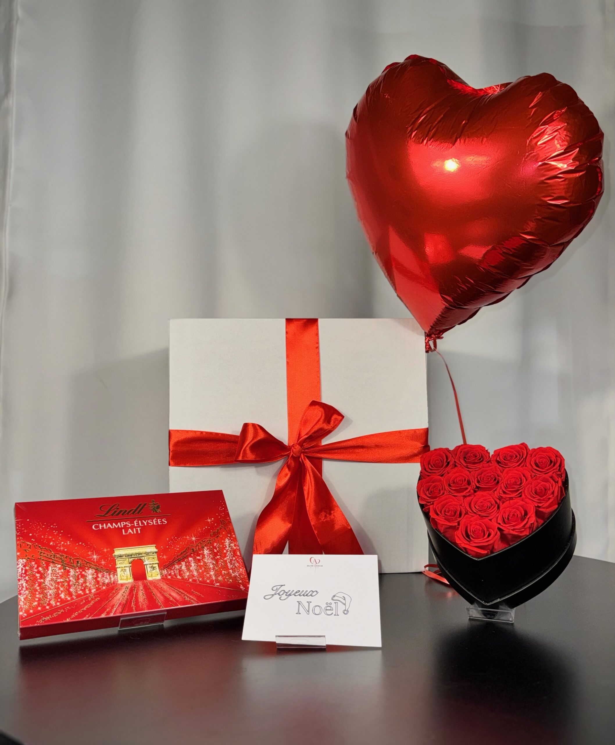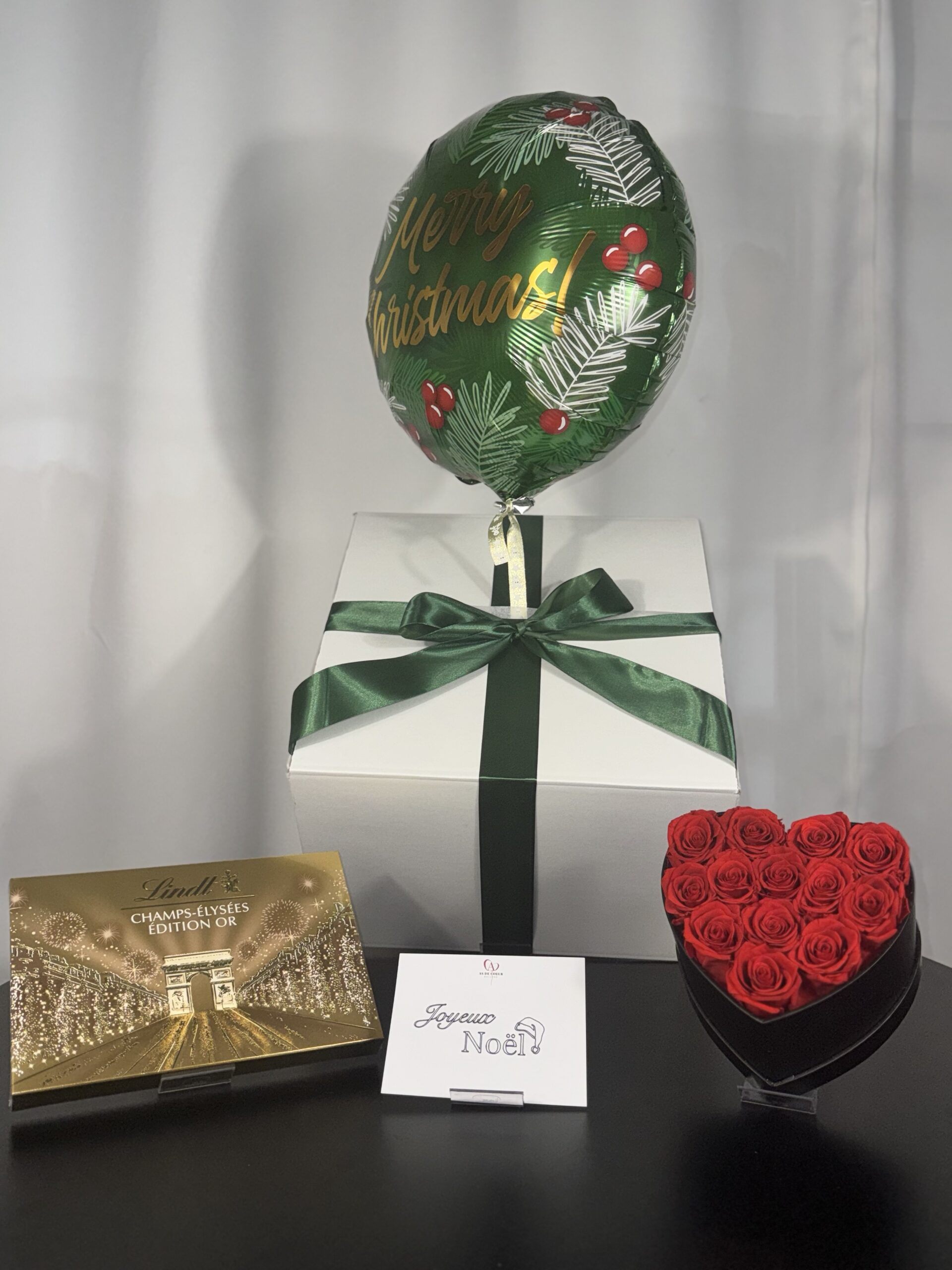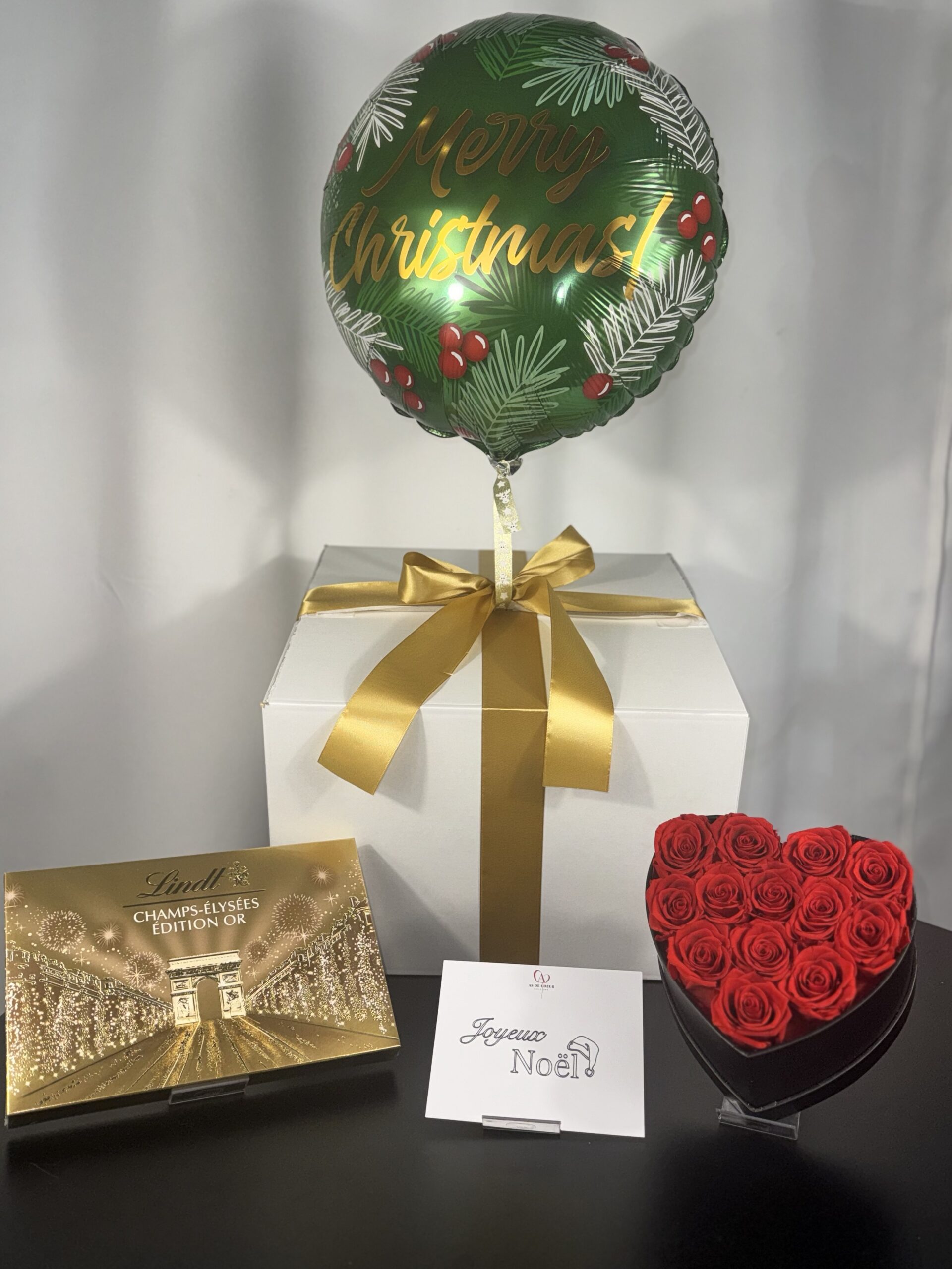 Ce pack contient 1 box cadeau avec un ballon à l’hélium, 1 coffret de chocolats Lindt, 1 coeur de roses éternelles ( roses véritables stabilisées pour durer environ 7ans ), et 1 carte » Joyeux Noël « .