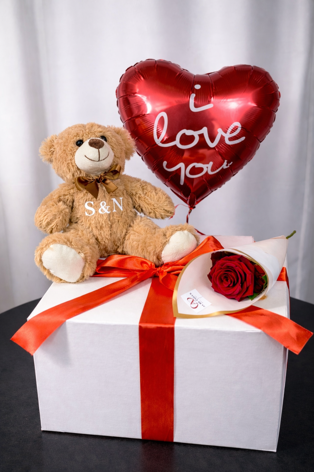 La Box As de Cœur réunit une peluche personnalisée, un ballon “I Love You”, une rose rouge et une boîte cadeau raffinée. Un coffret prêt à offrir, parfait pour une surprise romantique.
