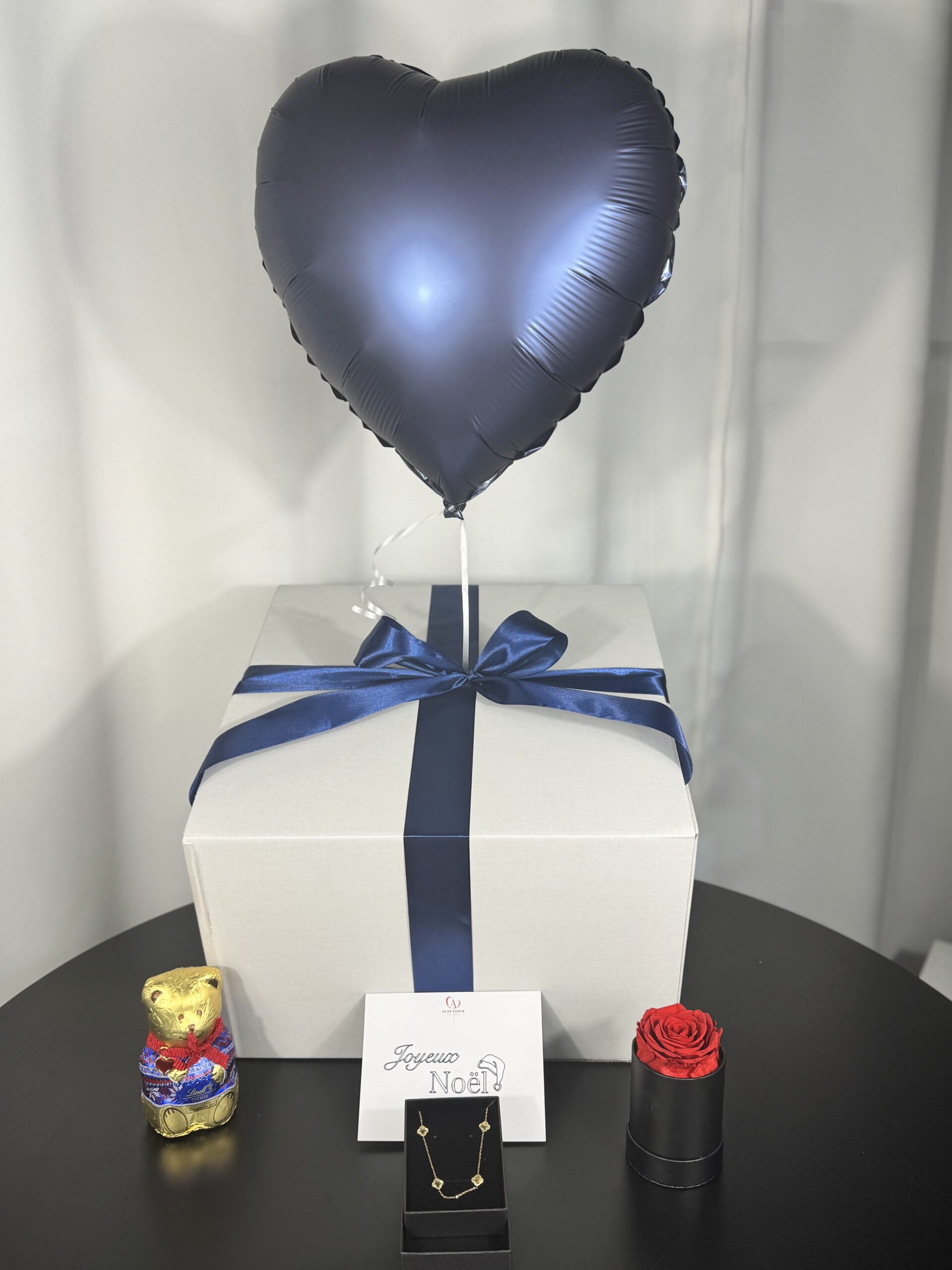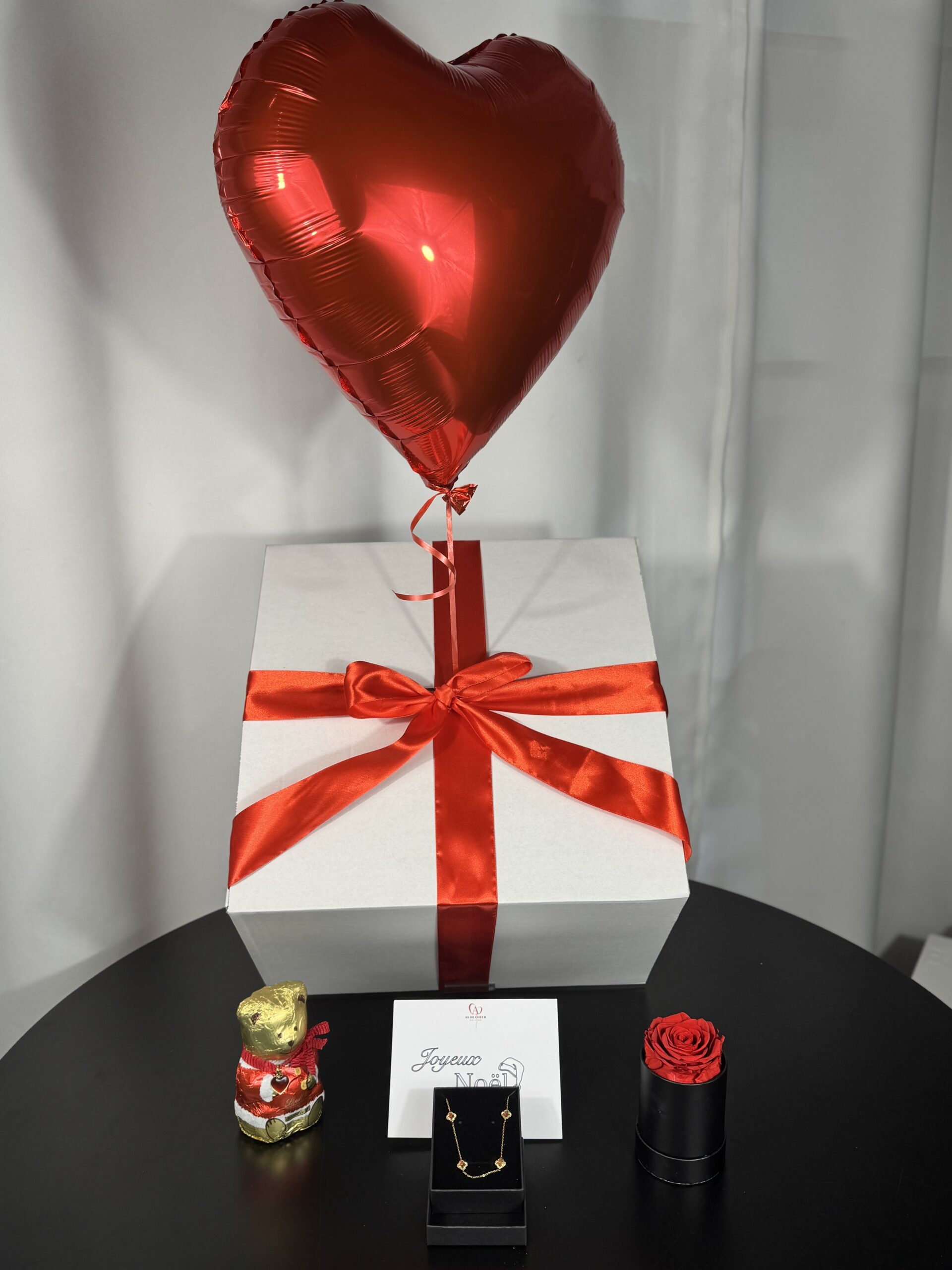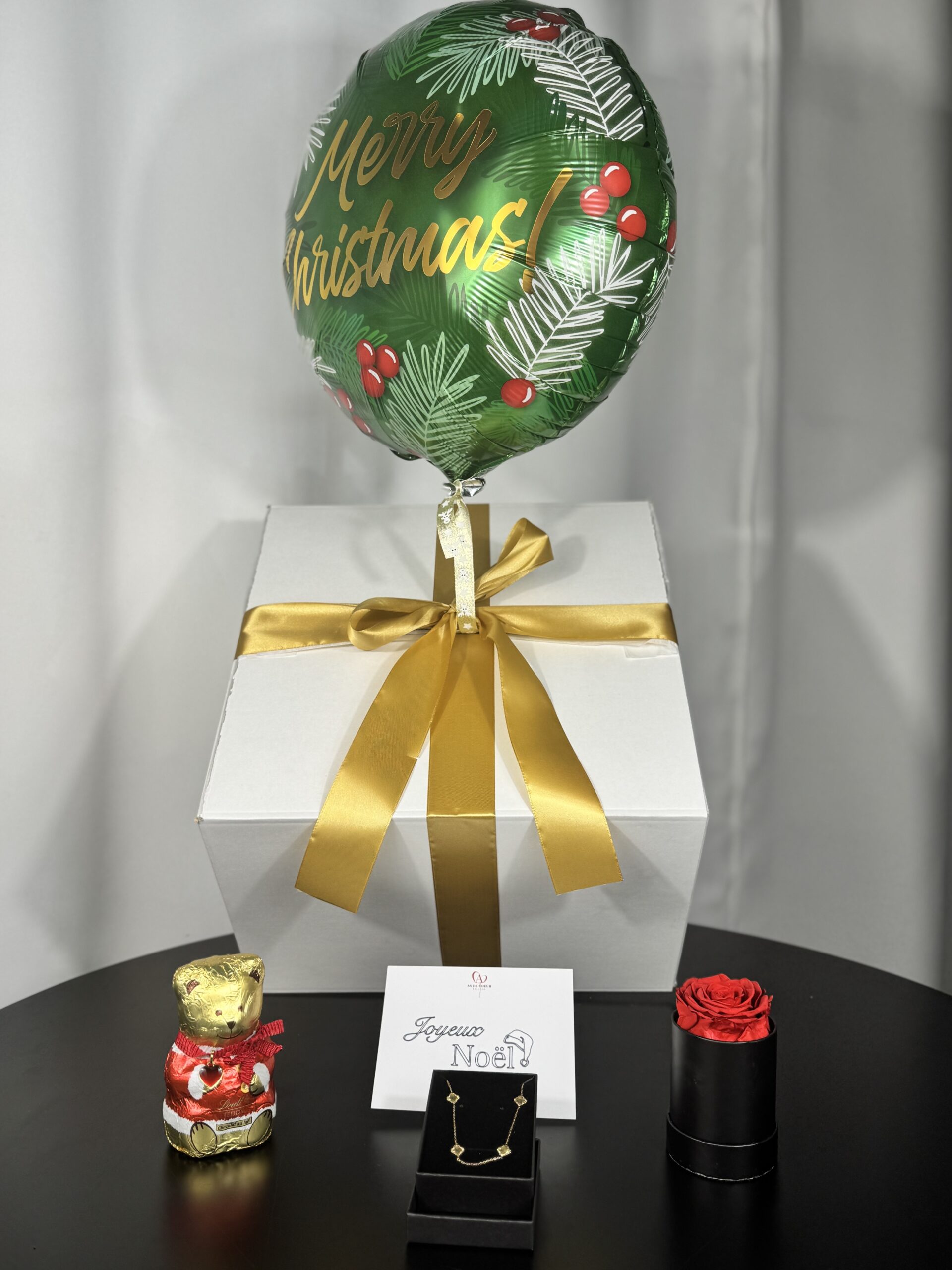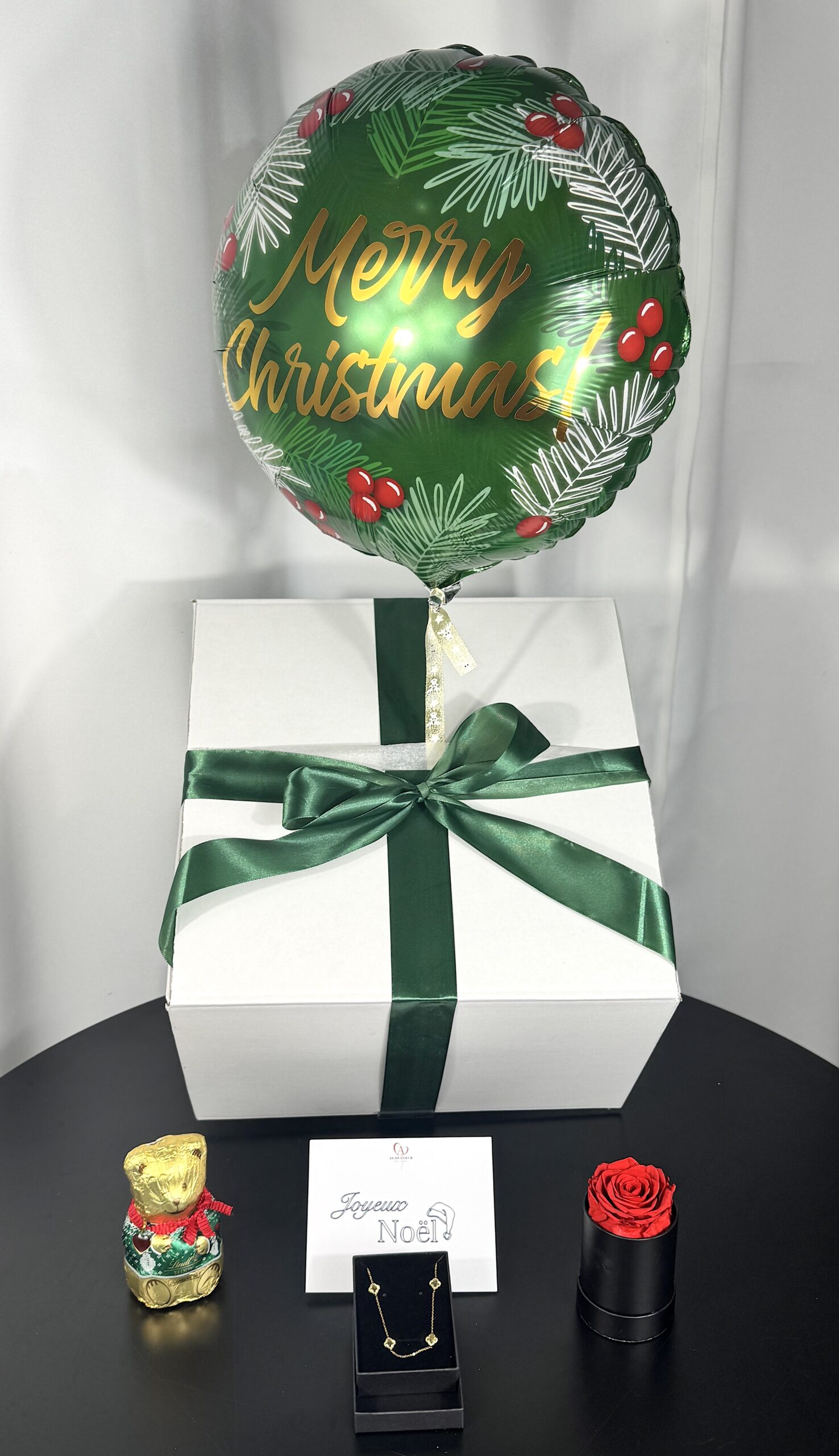 Ce coffret contient 1 box avec 1 ballon à l’hélium, 1 rose éternelle ( vraie rose stabilisée pour durer 7 à 10ans ), 1 collier en acier inoxydable couleur or, 1 carte « Joyeux Noël ».